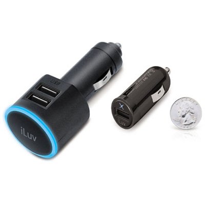 Power your devices on the go with the iAD119BLK from iLuv. The dual USB ports on this car charger let you charge up to two devices at once so you'll never have to choose between charging your phone or your GPS. Features include a 90 degree rotating head and a blue LED to let you know the power is flowing. Keep the clutter out of your car with this one sleek charger for all your USB devices.
